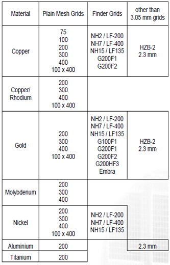 All our QUANTIFOIL ® support foils are available on a multitude of TEM grids. Commonly used are TEM grids made of Copper, Gold, Molybdenum, Copper/Rhodium, Nickel, Aluminium or Titanium with a diameter of 3.05 mm. In addition to plain mesh grids with 200, 300 and 400 mesh/inch we offer our support films on finder grids like G200F1, G200F2 and LF-200.