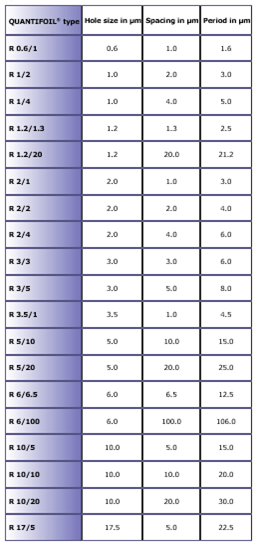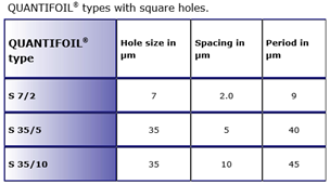 QUANTIFOIL® with square holes and relatively narrow bars can be used in electron microscopy to support a thin carbon film, which by itself is too fragile to span a grid square. The QUANTIFOIL® types with square holes constitute an optimum between a maximum of open area on the one hand, and mechanical stability on the other hand.