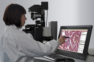 The cells of interest can be selected on the display using either the mouse, by freehand or predefined geometrical shapes which can be modified. Any number of cells across the slide can be identified as targets within one screening process. The stage is moving to trace the path drawn and the laser is fixed and focused from below.