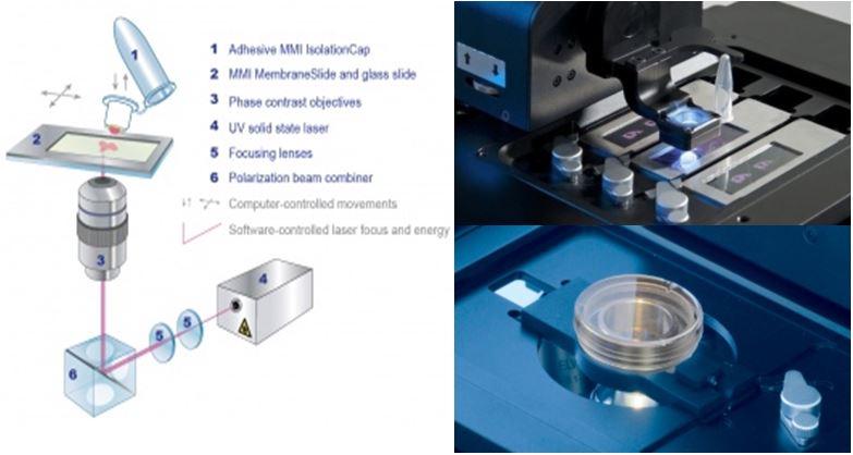 MMI CellCut:The ideal tool for the quick and precise detection and isolation of single cells or group of cells from variety of sample types including fresh frozen, paraffin embedded, archived slides, cytospins, smears and living cell cultures for downstream molecular biology analysis or diagnostic purposes. It enables cell selection quickly and easily directly on the touch screen. The cells of interest are marked and cut automatically using a precisely focused UV-Laser. The microdissected samples are collected for downstream analysis. This results in a pure cell population for reliable analysis and diagnosis. It is highly modular and can be mounted on numerous brands of microscope from entry level, mid-range to high end.