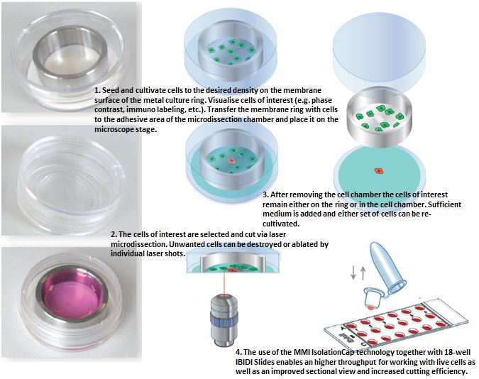•MMI LiveCell Chamber: low power laser allows an gentle cut. In specially designed MMI LiveCell Chamber even live cells can be microdissected, for unrivalled success in re-culturing and cloning. Protocol live cell dissection