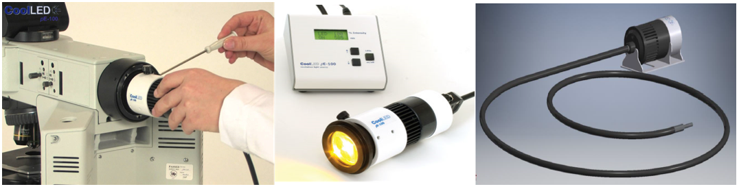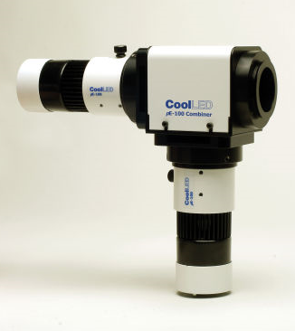 1.Direct fit to microscope configuration: pE-100 units can be combined using the pE-Combiner for applications requiring a second LED wavelength with independent control and triggering.