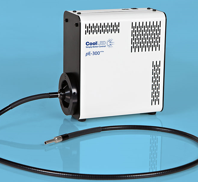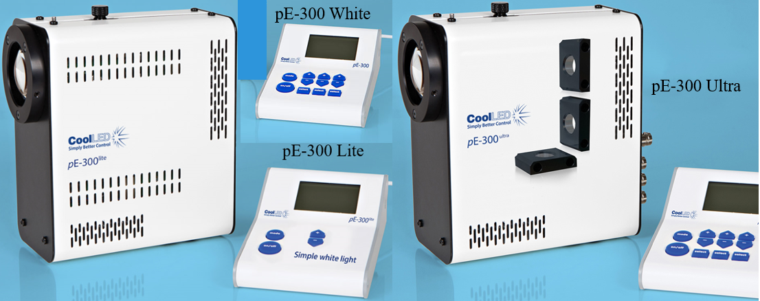 3. pE-300 Ultra – offers precise control over wavelength, intensity and shuttering. Triggering multiple TTL inputs coupled with the ability to mount inline excitation filters provides microsecond switching of pre-filtered excitation light. Unique “Sequence Runner” multiple channel excitation mode to define the order of their fluorophore capture using the pE-300ultra Control Pod, then the pE-300ultra light source can accept a single TTL output from the experiment set-up’s camera to initiate the step-through of a sequence of excitation channels. This feature is independent of the individual channel TTL inputs on the light source. This offers users the facility to run through a sequence of excitation channels using a camera which has only a single TTL-out.