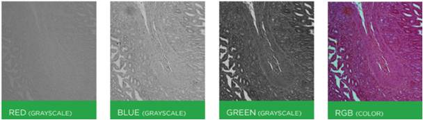 Conventionally, transmitted light color images have been acquired using white light sources and color cameras. However single-exposure acquisition of color information comes at the expense of lower speed, less spatial resolution, reduced dynamic range and increased noise in color cameras compared to gray-scale cameras.