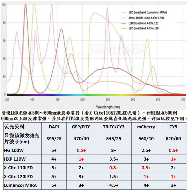 MIRA光引擎提供强大,稳定,反应灵敏荧光激发,紫色/青色/绿色/红色光源输出为DAPI/FITC/TRITC/Cy5的和其他类似的荧光染料优化了有效的激发。每个光源可开/关独立地接通或组合使用以产生白光输出。此外,光源输出强度独立控制有利于荧光信号的平衡在2/3/4彩色成像应用。光源控件选择允许用户在同一时间通过多波段激发多重标记的样本一/二/三/四个荧光染色,而激发选择不需要使用滤光轮,滤片切换或其它机械设备来获得。