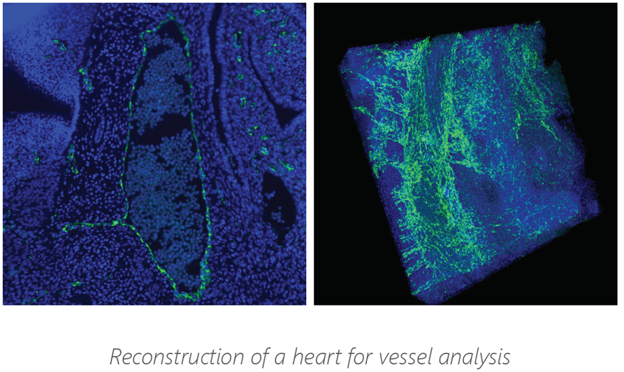 » 3D whole slide imaging:Access extremely large volumes (>500GB) on all magnification levels and all regions – 3D field of view can be defined after imaging instead of setting it previously as with confocal or multi-photon imaging.