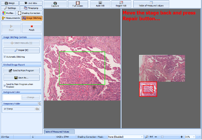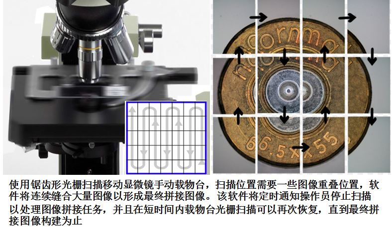 •使用摄像机的实时取景和手动载物台的无缝高品质图像拼接