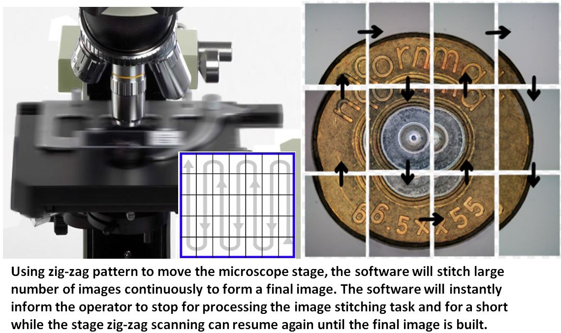•Seamless high quality image stitching using live view of a camera and a manual stage