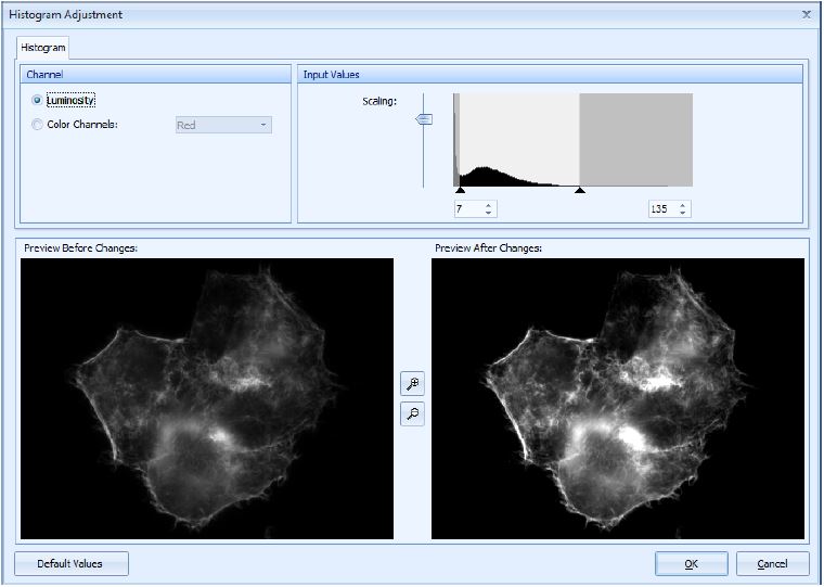 •Histogram and intensity of each of the fluorescence images can be adjusted independently