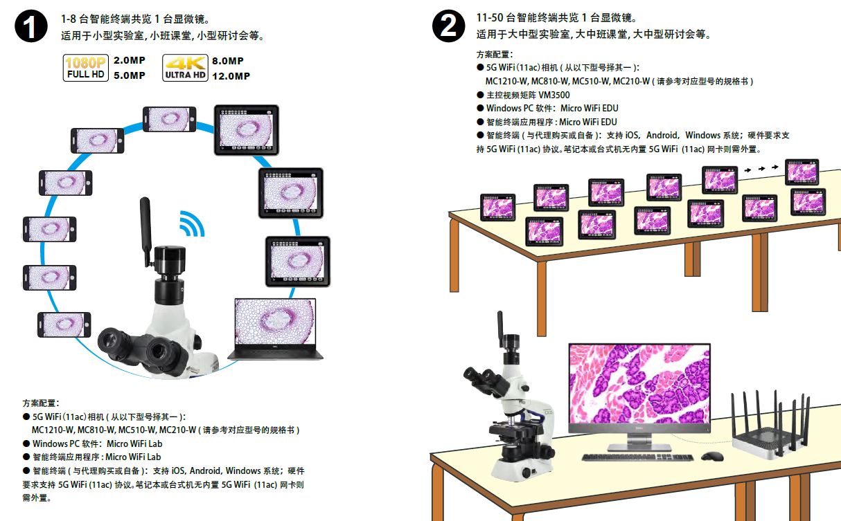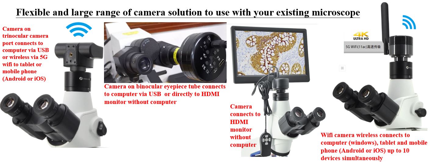 5G Wifi camera in choice of 2M, 5M, 8M & 12M resolution to generate hotspot from the camera itself and through our APP to connect up to 10 devices, including Android phone 5.0 or above, iPhone 6 or above, iPad Air 2/mini 4 & iPad Pro, Windows computer with wireless network card, standalone LED monitor with Android stick. It provides the most flexible solution to maintain the best image quality for your experiment demonstration, teaching, group discussion and training etc... It can replace your microscope with teaching multi-heads and projector for lecture hall image display. The camera itself can support up to 10 devices and an option to add a 5G array port extends the support up to 50 devices best fit for class teaching purpose.