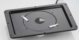 •This metal plate fits in the opening of the stage and creates a flat temperature controlled surface at the same height as the rest of the XY stage. It features a trimmed 24 mm diameter circular observation opening for imaging. It is compatible with oil immersion lenses.
