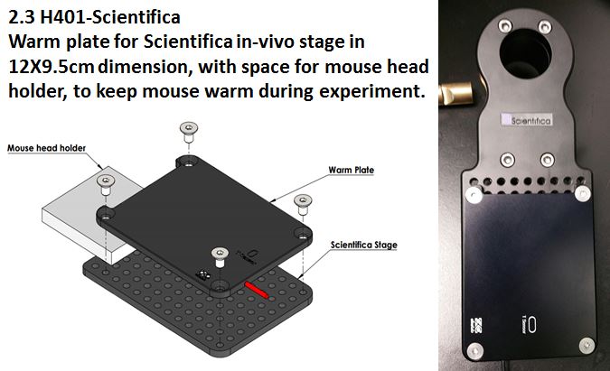 •Compatible with all the upright microscopes equippend with glass slide holder. This plate realizes a warm surface under the glass slide holder. It features a 40x15 mm rectangular opening for imaging.