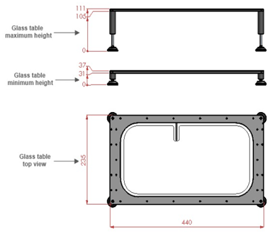 •此ITO玻璃板装配在载物台的开口,并跟XY台在相同的高度产生一个平坦透明的温度控制的表面,铝框提高平整度。玻璃厚度为0.5毫米。该板上升XY载物台的焦平面2.5毫米