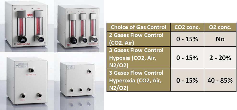 •CO2 and O2 gas control inside the Micro - Environmental Chamber: same as all the choices for microscope stage chamber gas controller.