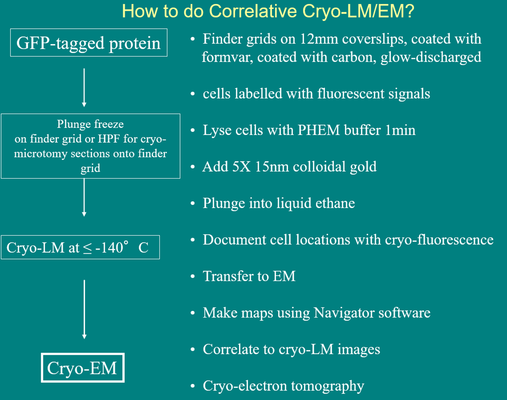 *Cryo-LM maps of fluorescently labeled structures can be correlated to those mapped in the EM