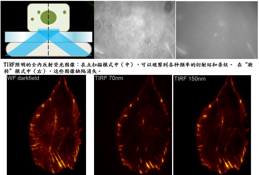 当激光束聚焦在物镜的后部并以圆形旋转时,该圆形的每个点在盖玻片上产生具有相同入射角的平行光束。因此,在TIRF中对于固定波长,从每个点产生的消逝波具有相同的穿透深度。然而,干涉引起的杂讯号形状取决于波束的方位角。能够在相机的曝光时间期间非常快速地旋转激光束,模糊条纹或环形图案,提高图像均匀性。
