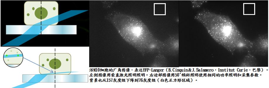使用倾斜照明以降低由聚焦平面产生的背景模糊并增强激发照明(暗场激光照明)。 因此,用户获得高图像质量和实现较少的激发功率与较少的观察漂白或实现更快的采集速率。 斜照明切片是暗场激光照明的延伸。 对于高入射角但小于临界角,起始TIRF范围,穿过样品的激发光束角度非常高,使得照射到达样品的厚度非常薄(约2μm)