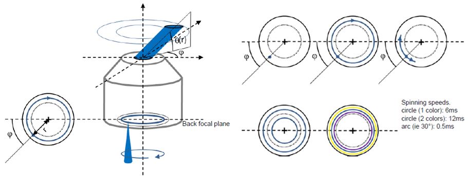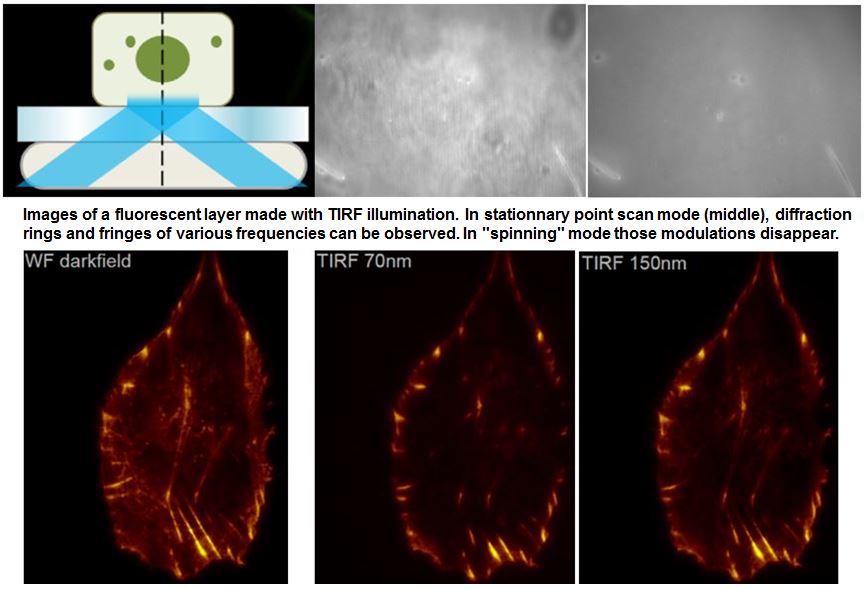 When a laser beam is focused at the back of an objective and spins to describe a circle, each point of that circle creates a parallel beam which has the same incidence angle onto the coverslip. Thus in TIRF and for a given wavelength, the evanescent wave resulting from each spot has the same penetration depth. However, interference induced patterns depend on the azimuth of the beam. Being able to spin the laser beam very rapidly during the exposure time of the camera will blur uniformities such as fringes or rings patterns.