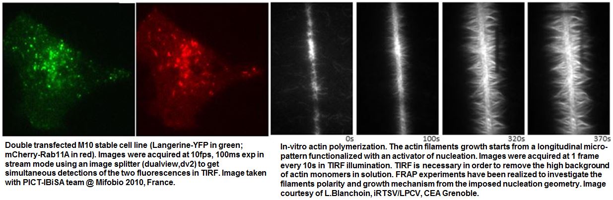 Total Internal Reflection Fluorescence (360° TIRF) microscopy is the ideal technique for observations close the coverslip surface as it provides the highest axial resolution possible (between 60 to 300nm depending on the angle of incidence). This technique covers a large field of applications such as single molecule tracking, imaging secretion processes, interaction of cell membrane with matrix components or actin filament behavior.