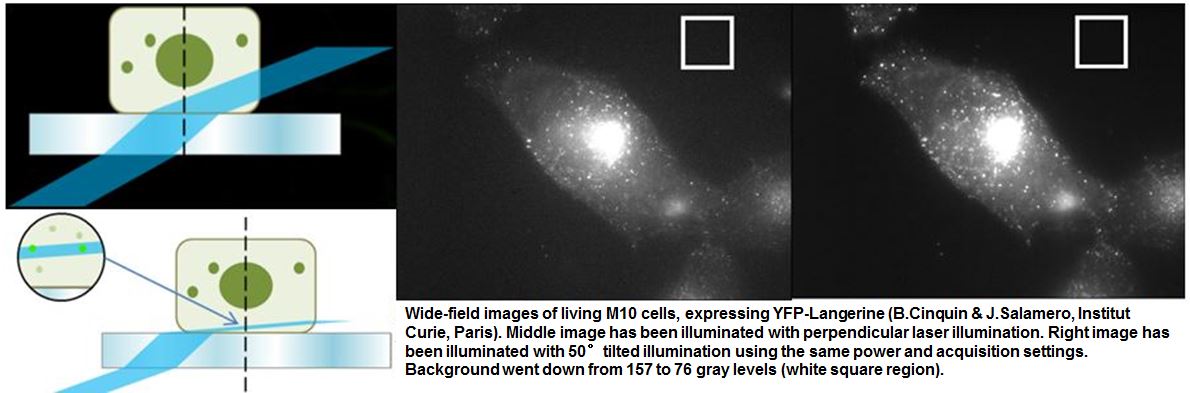 Using tilted illumination to lower background blur that results from out-of-focus planes and to enhance the excitation illumination (Dark field laser illumination). As a result, users maintain image quality and achieve less excitation power with less observational bleaching or faster acquisition rates. The oblique illumination sectioning is the extension of the dark field laser illumination. For high incident angles but smaller than the critical angle, starting the TIRF domain, the angle of the excitation beam going through the sample is so high that the illuminated thickness is very thin (around 2μm).