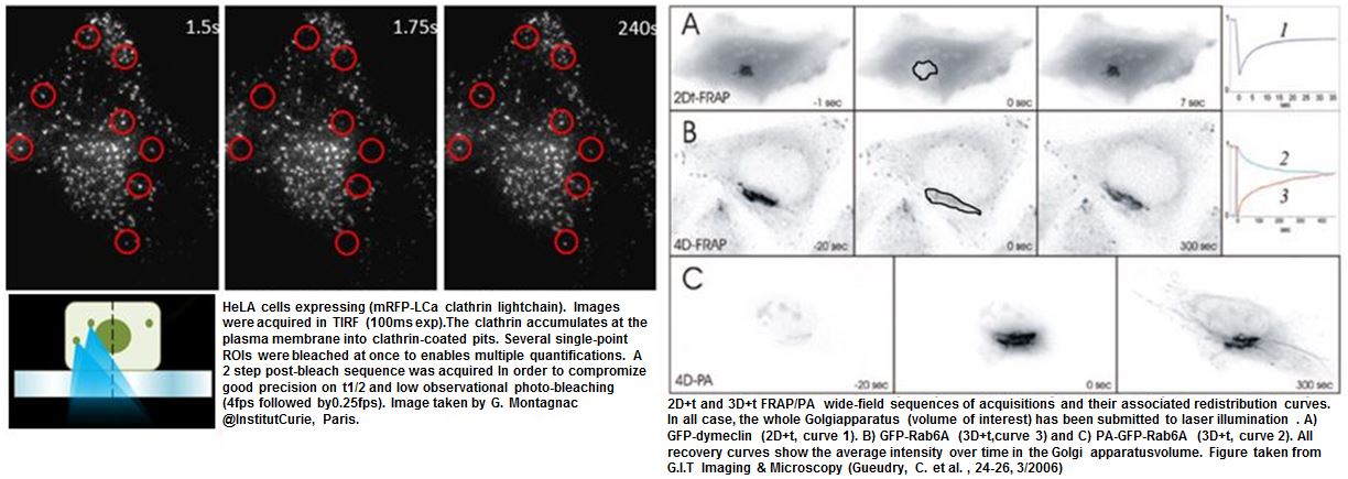 Localized laser action techniques such as Fluorescence Recovery After Photobleaching (FRAP, FLIP), photoactivation, uncaging, photoablation are very powerful tools to photo-manipulate tissues or to analyze intracellular dynamics of proteins and other macromolecular complexes. For example, FRAP permits perturbation of the steady state fluorescence distribution by bleaching fluorescence in selected regions. After the bleaching step, researchers can observe and analyze how the fluorescence distribution returns to the same or a different steady state, giving appraisal on the spatiotemporal half life of molecule of interest within one particular site of a living sample. Photo-activation or photo-conversion make use of photo-convertible probes, allowing morphological “pulse and chase” experiments.