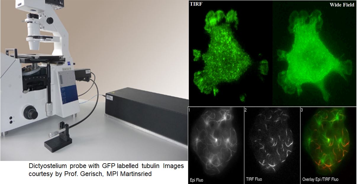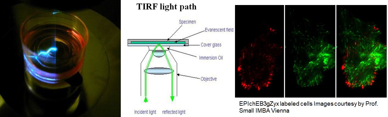 TIRF technique is a special kind of wide-field fluorescence technique for measuring cells or single molecule counting in an evanescent field without haze. By total reflection of the exciting light at the coverslip / medium interface, the fluorescence excitation is limited to a very thin space in the vicinity of the glass surface. The resulting fluorescence images exhibit extremely high contrast and resolution with the possibility of realtime imaging of cell membrane or labelled single molecules counting.